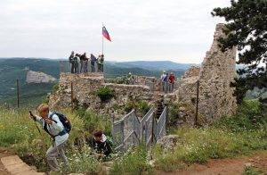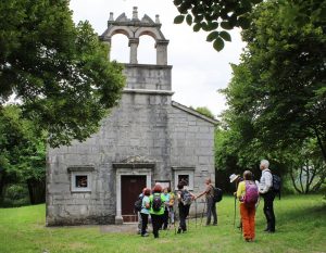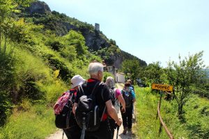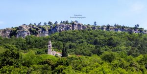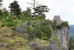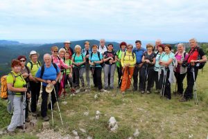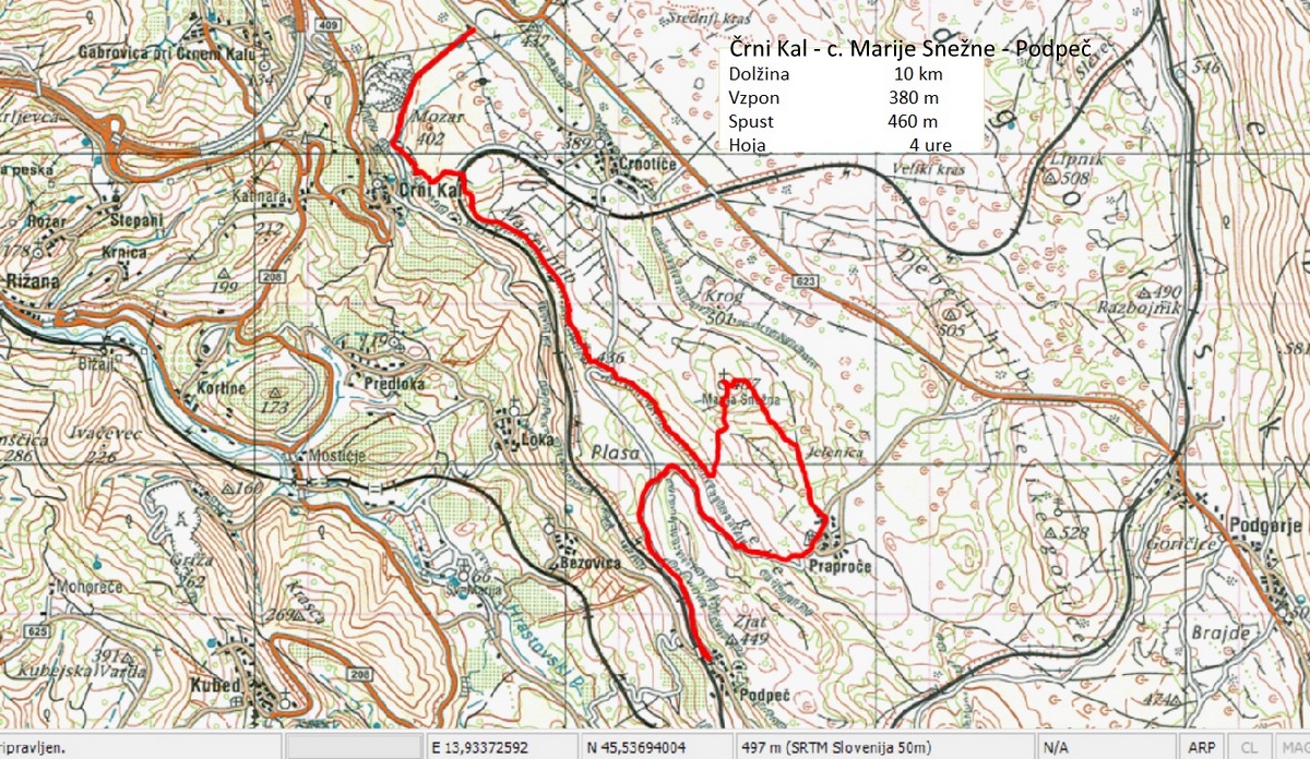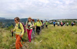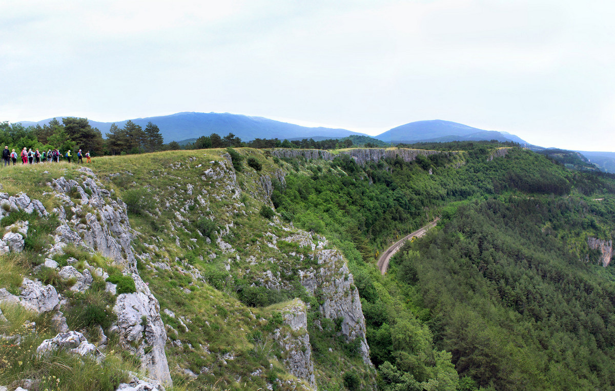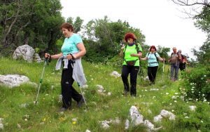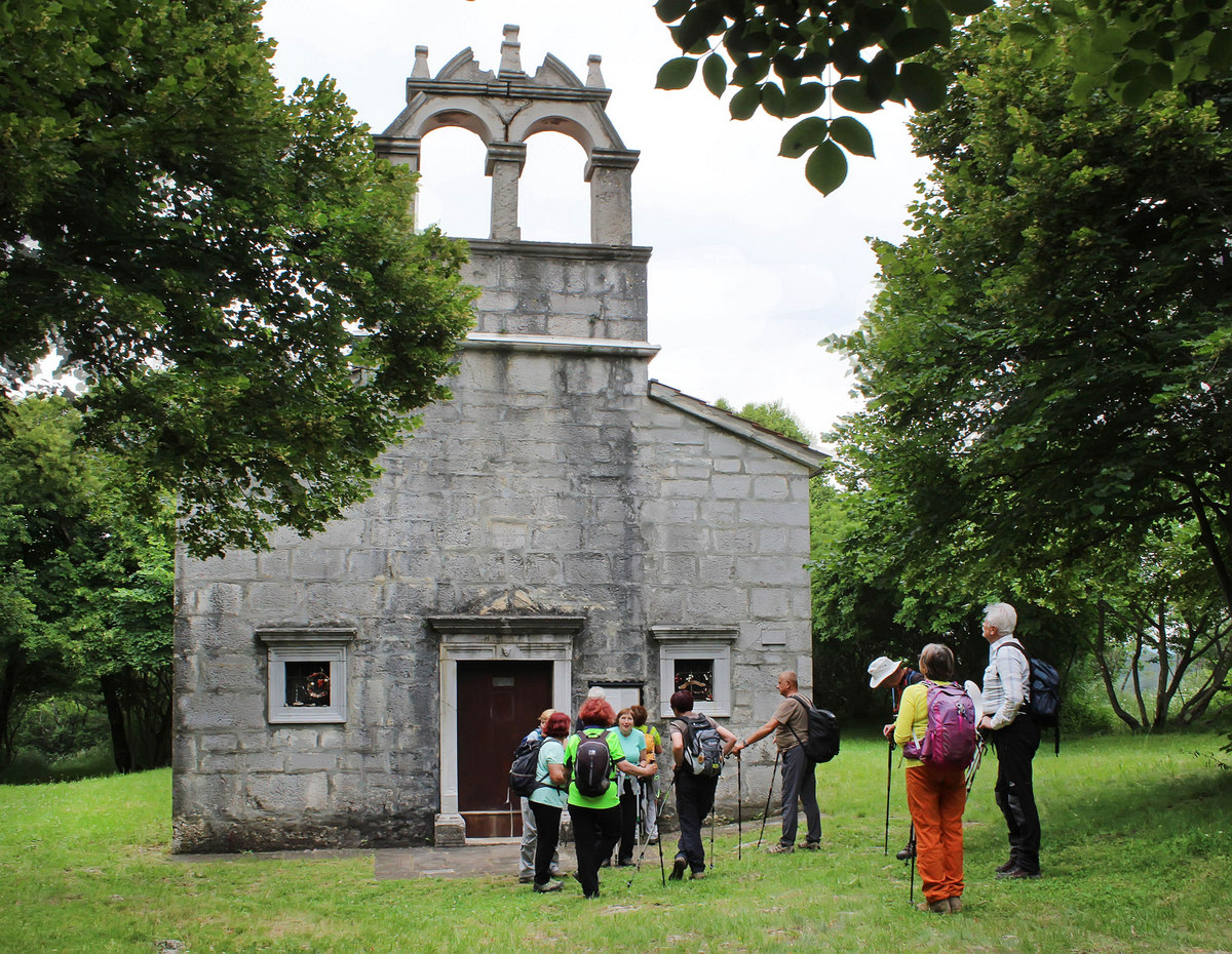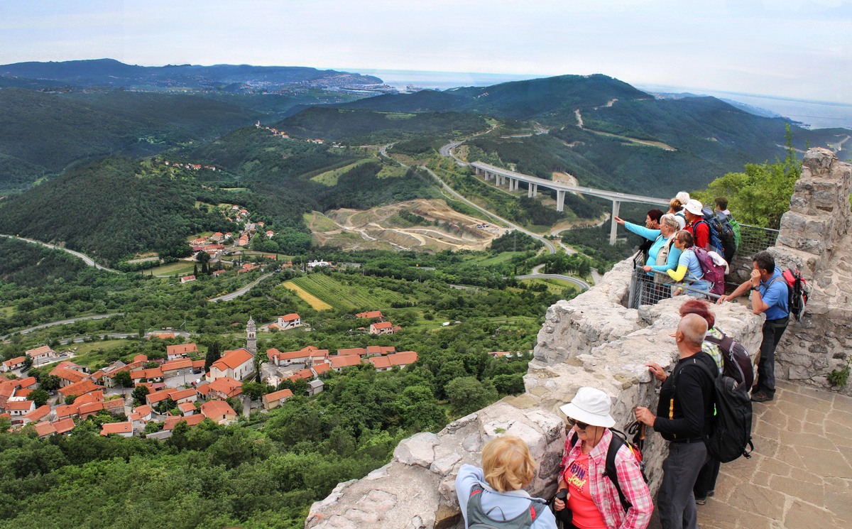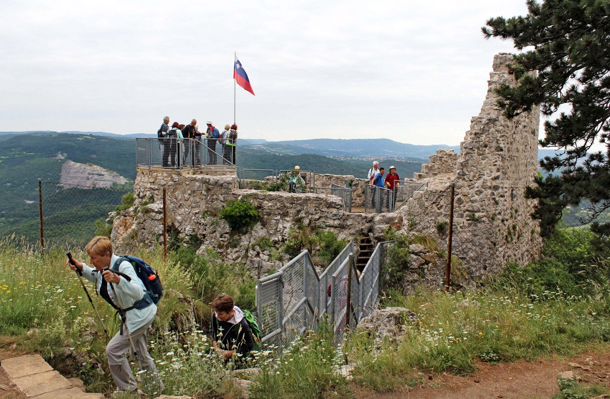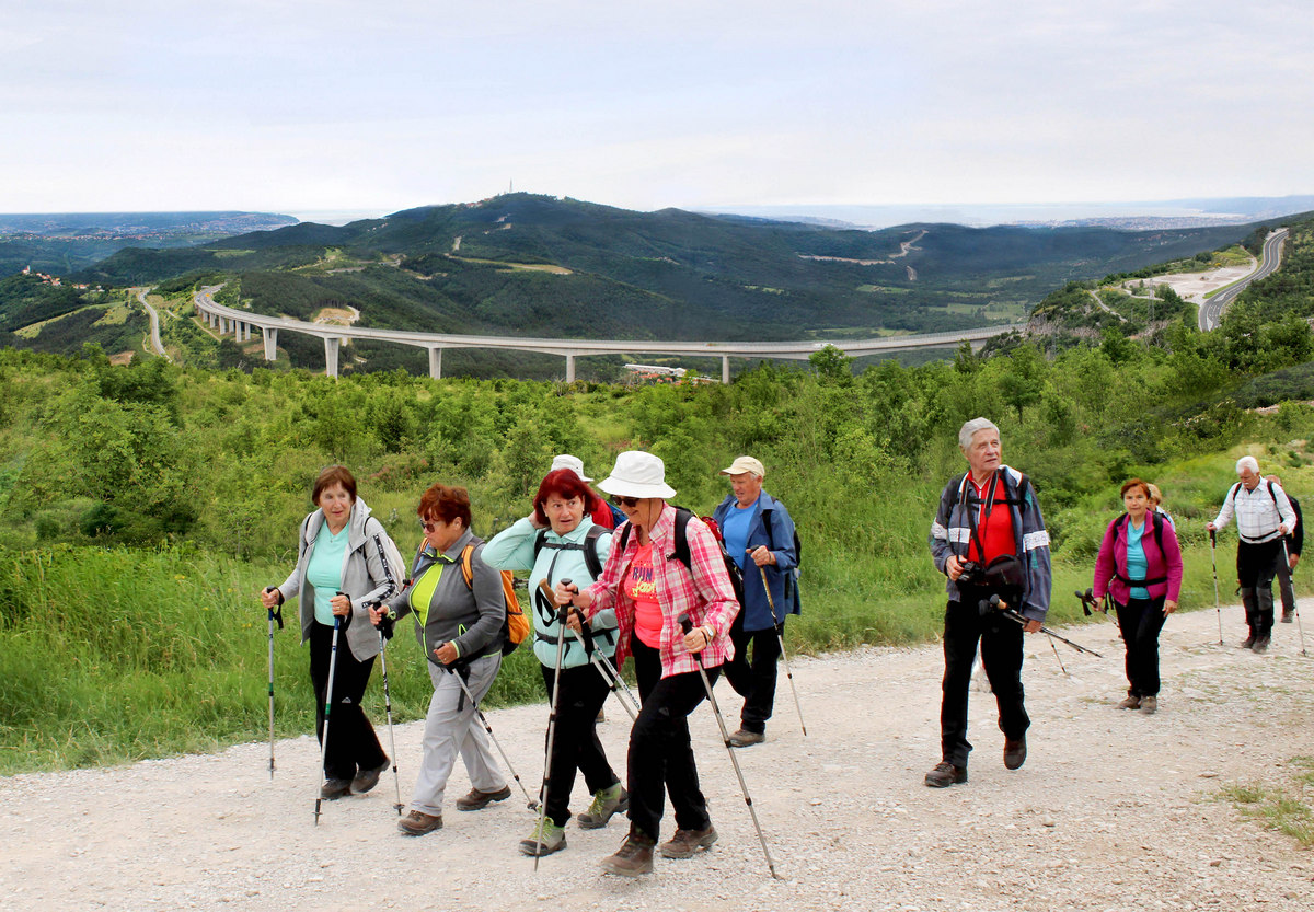 Pot nas je vodila pod drevesne krošnje, med nizko grmičje in divja rastišča špargljev, v travno pokrajino z vonjem po rožah, zeliščih, začimbah in morju. Občudujem ta kamniti kraški svet brez potokov z malo zemlje med belimi kamni, da najde tako moč za bujno cvetenje rastlin in trav, ki so se upogibale v vetru. Drobni cvetovi krvavordečih klinčkov med srebrno cvetočimi travami so kakor rdeče kaplje v šopkih krasile kamenje, naša pot pa se je dvigala in čez okop grušča smo prišli na Gradišče s cerkvijo Marije Snežne z značilnim kraškim zvonikom ter našli senco pod cvetočimi lipami, nato pa po kolovoznih poteh med naravnimi vrtovi cvetočega ruja v segretem dnevu hiteli proti vasi Praproče z zanimivim zvonikom ob pokopališču, naša kolona pa je izginila v borove sence nazaj proti obrobju strmih sten z oddajnikom. Čez gozdiče in pašne površine smo se postopno spuščali, razglabljali, kako globoko pod nami topotajo vlaki in čez čas prečili železniško progo. Sonce je žgalo, mi pa smo prišli v vas Podpeč pod mogočno steno s stolpom in se okrepčali s hladno pijačo ali kavico.