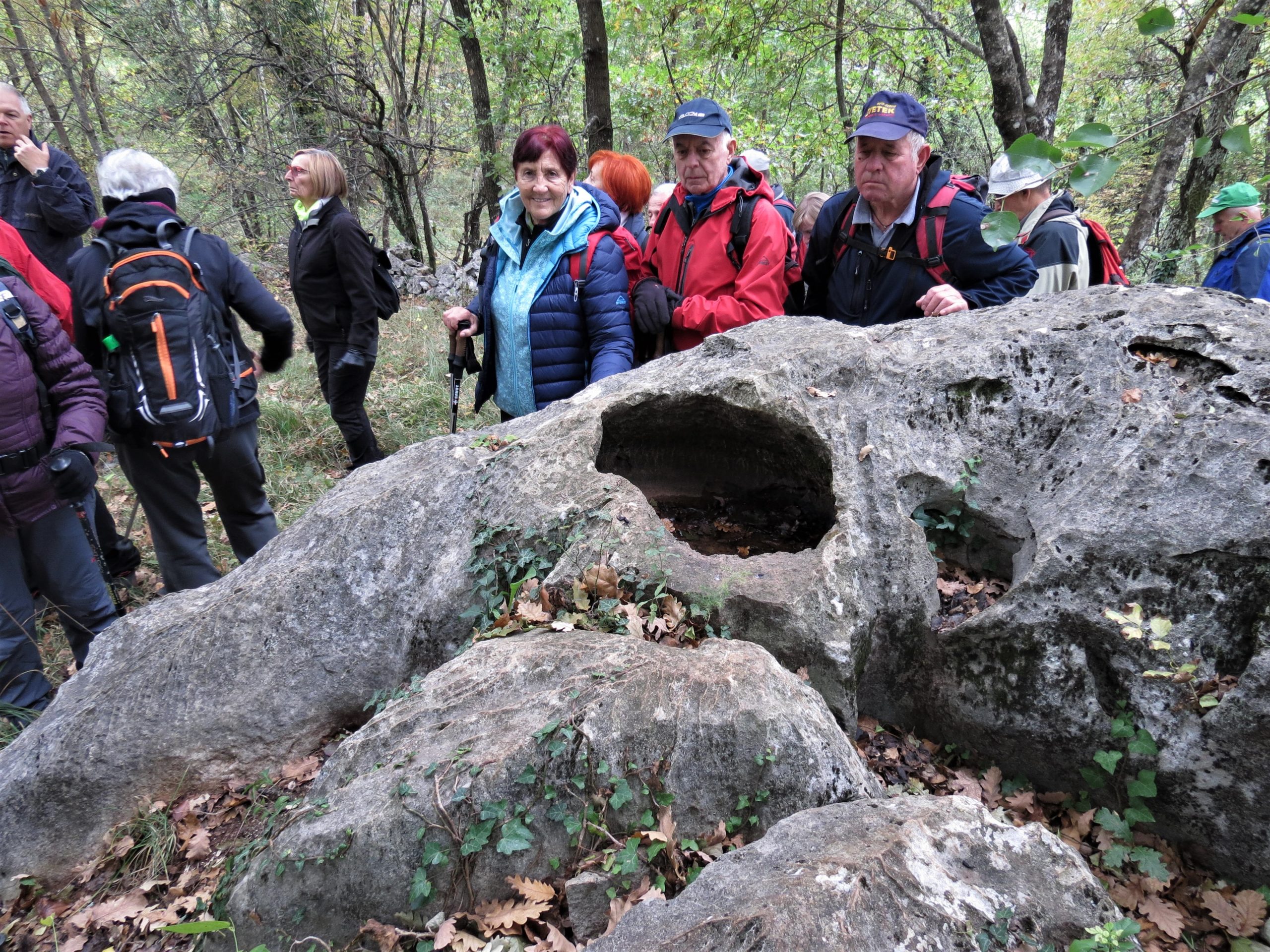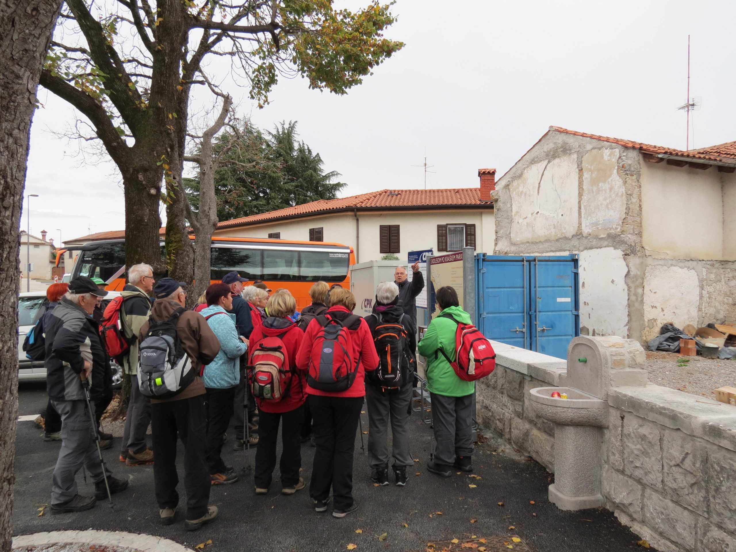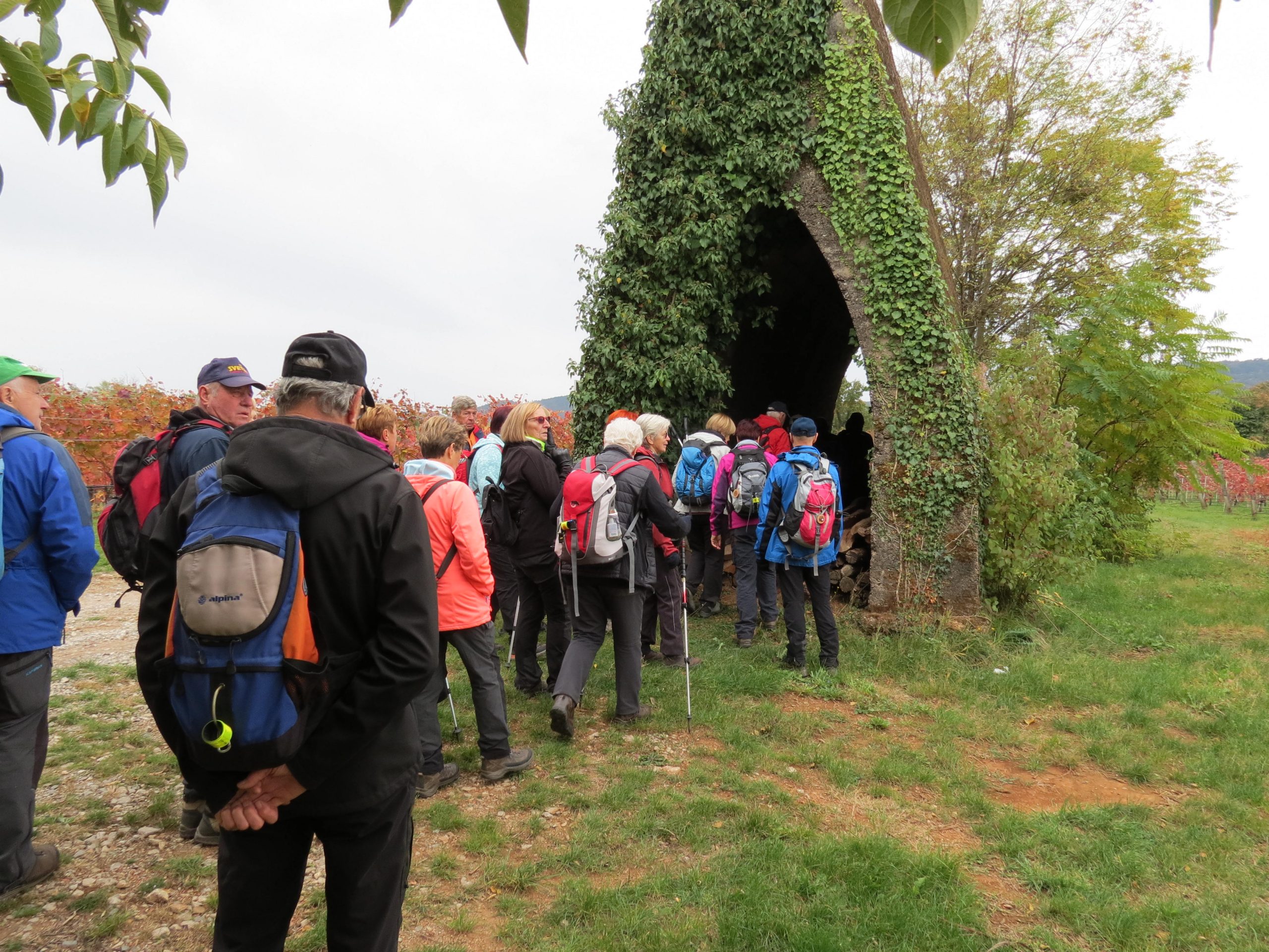 Kot vedno smo ob prihodu pričeli z jutranjo kavico. Tam nas je že pričakal vodnik Bogdan in odpravili smo se po Teranovi poti. Priporočam jo vsem, ki boste kdaj obiskali Kras. Ob poti med vinogradi in gmajnami, poraslimi z grmički jesensko žarečega ruja nam je ob postankih povedal še toliko drugih zanimivosti, ki so popestrile naš sicer malce oblačen, pa kljub temu od jesenskih barv žareč dan.