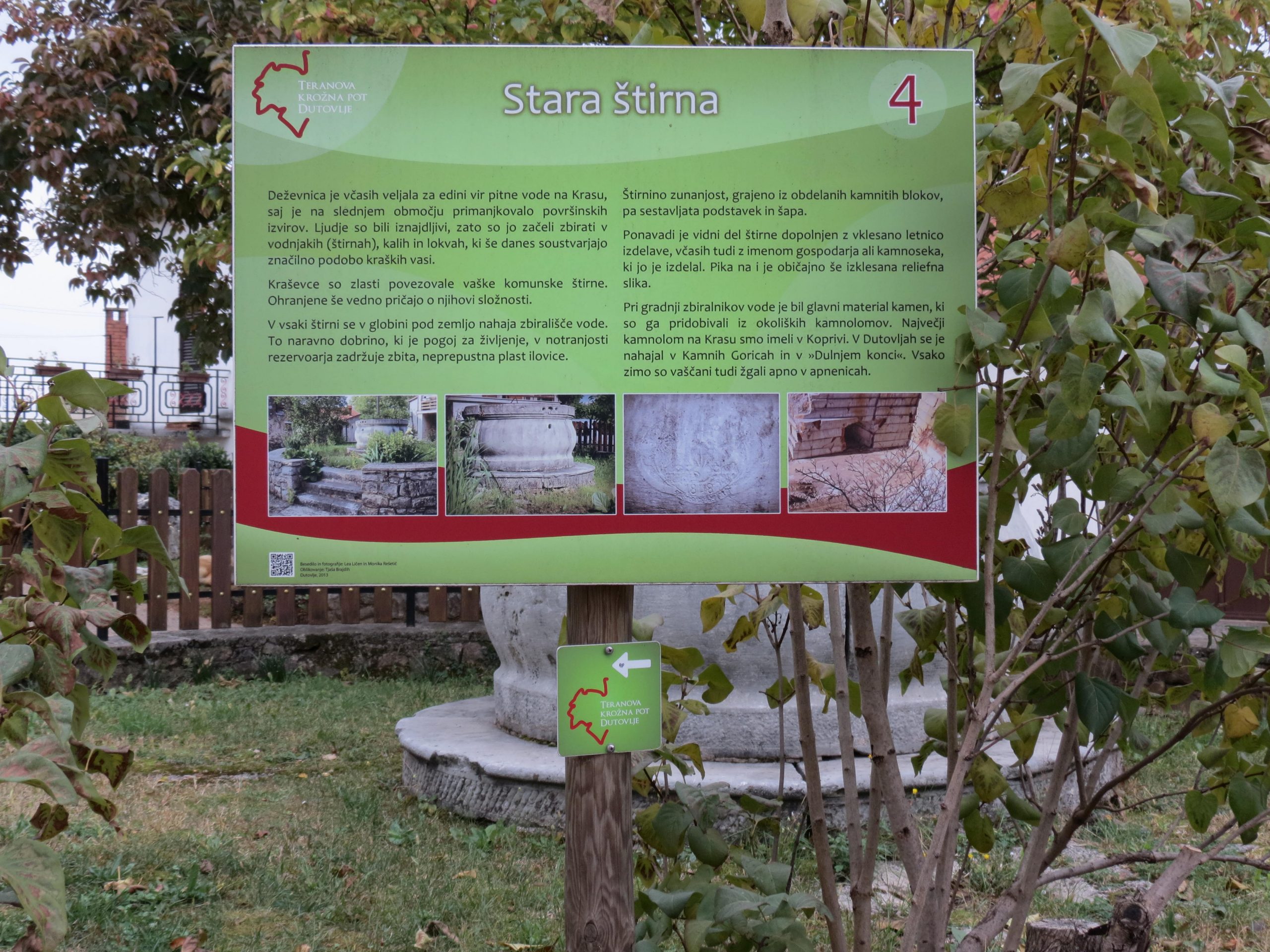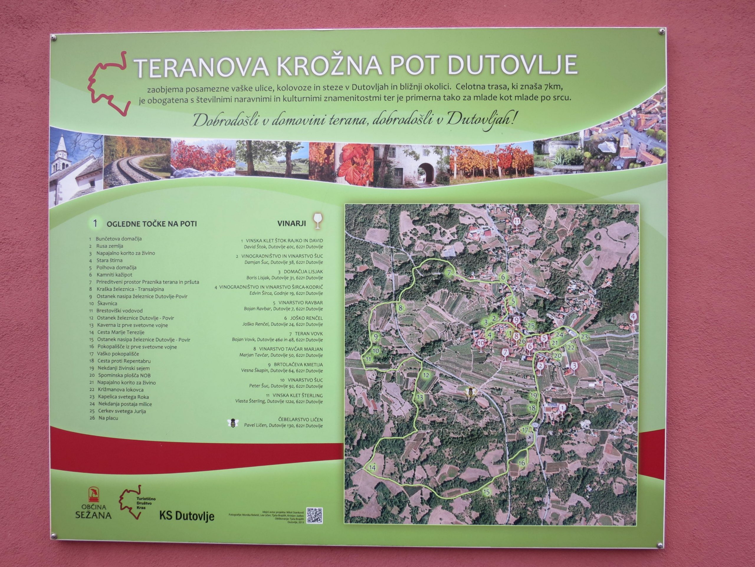 Krajani so sami naredili Teranovo pot, na kateri smo spoznali: Bučnetovo domačijo, Duljni konc, najstarejšo Polhovo domačijo, Prireditveni prostor, Kraško železnico Transalpino iz začetka 20. stol., Avstroogrsko vojaško pokopališče iz 1. svetovne vojne, Skladišče municije med 1. svetovno vojno, Kaverno-zaklonišče prav tako iz tega obdobja, spominsko ploščo iz NOV, cesto Marije Terezije oz. semenjsko pot, Škavnico z vdolbino za zbiranje vode, hudomušnega Kamnitega vremenarja,… Naj omenim še Pepin pravi kraški vrt, ki je na hortikulturni razstavi l. 2009 v Angliji, osvojil najboljšo oceno v kategoriji Malih vrtov. Veliko zanimivosti nam je vodnik povedal o Borisu Pahorju, ki se je iz Trsta vedno rad vračal v Dutovlje in tam ustvarjal. Tu ima tudi spominsko sobo, katero smo ob koncu poti obiskali. Pohod smo, kot se spodobi, zaključili v kleti domačina, ki nam je postregel s kraško malico in odličnim teranom.