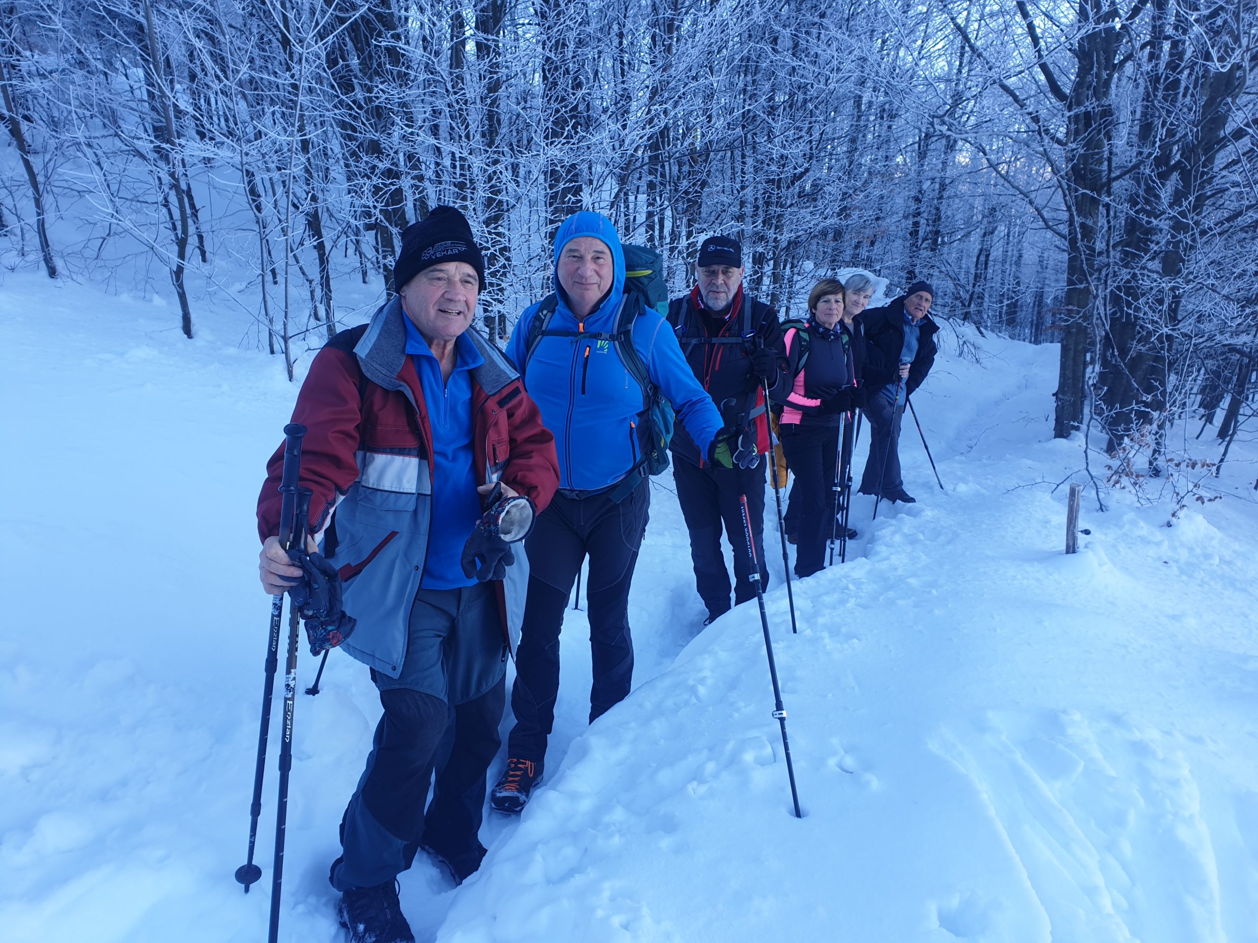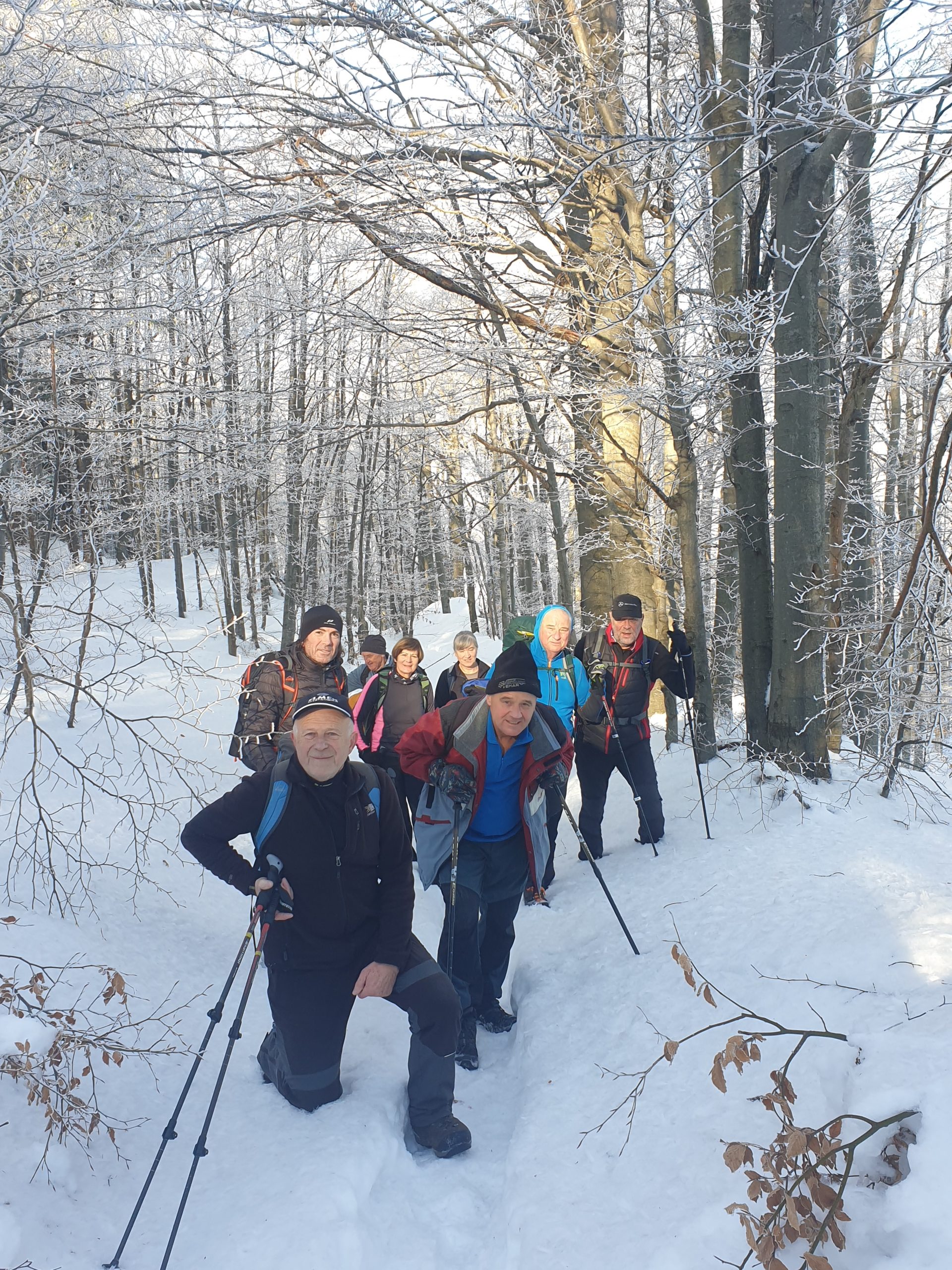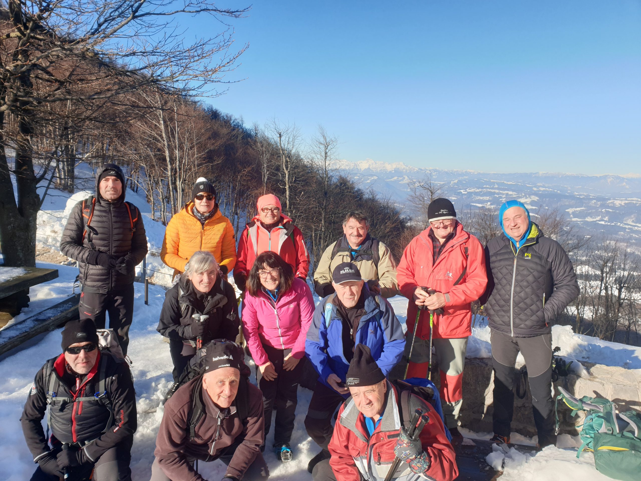 V soboto, 18. decembra, smo se Veseli Triglavci odpravili na Javornik (1240 m). Gora se nahaja JV od Črnega Vrha, ki je bil tudi naše izhodiščno mesto. Začetna hoja po cesti se je po prvi serpentini kmalu preusmerila na gozdno pot, kjer smo ves čas hodili po dobro utrjeni gazi. Po prečkanju parih kolovozov smo prišli do zaselka Šajsna Ravan. Ves čas so nas usmerjale dobro označene markacije ter vodstvo našega izkušenega vodje Jožeta Školca. Prekrasen sončen dan in veliko snega je ustvarjalo prelepo zimsko kuliso. Dinamična pot je imela vzpone in spuste in nas je iz severnih pripeljala na južna pobočja, kjer bi v smeri naravnost prišli do Pirnatove koče, a smo krenili desno. Zadnji vzpon, ki nas je vodil direktno do razglednega stolpa je bil dokaj strm, zato je bil potreben previden korak. Po približno treh urah smo zagledali razgledni stolp. Nekateri smo se nanj tudi povzpeli. Prekrasen razgled nad zasneženimi krošnjami nam je odprl pogled na Škofjeloško in Cerkljansko hribovje ter v daljavi Dolomiti, Julijske Alpe, Karavanke, Kamniško Savinjske Alpe in Snežnik. Na samem vrhu je bilo lepo a zelo vetrovno. Po okrepčilo smo se spustili navzdol in po desetih minutah dosegli Pirnatovo kočo. Ob prijaznem vzdušju, odlični hrani in pijači ter gostoljubnimi oskrbniki, smo izkoristili priložnost in ob spremstvu kitare zapeli še našemu dolgoletnemu članu in vodji marsikaterega pohoda, slavljencu Srečku Kraševcu za minuli rojstni dan. Zaželeli smo mu še veliko pohodov, da bi bil zdrav in čil še vrsto let ter nas zabaval s svojimi domislicami in planinskimi dogodivščinami. Po obveznem slikanju smo si nadeli dereze in se napotili v dolino. Držali smo se smeri za vas Lome. V Črni vrh smo prispeli mimo smučišča ter tekaških prog.