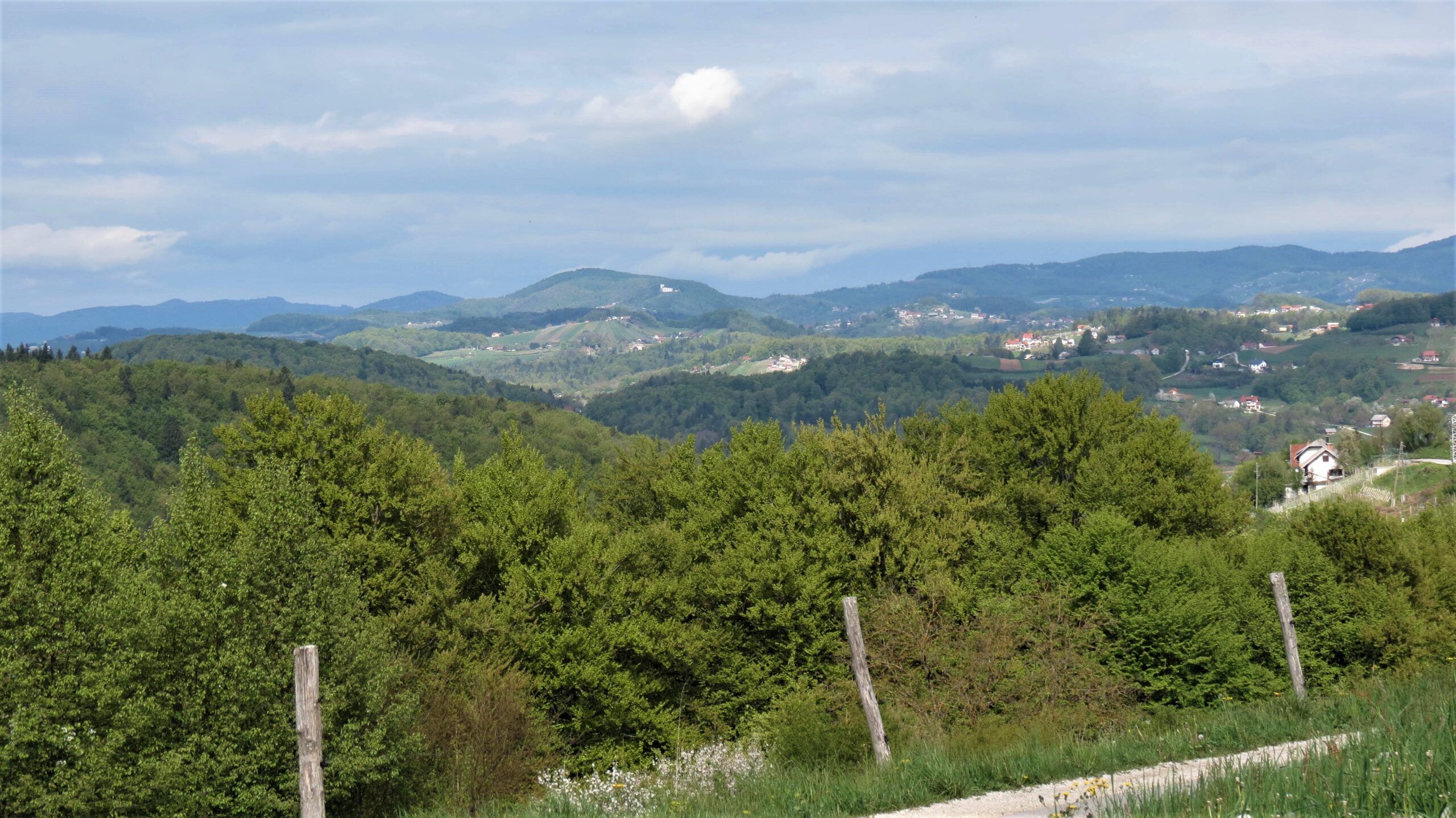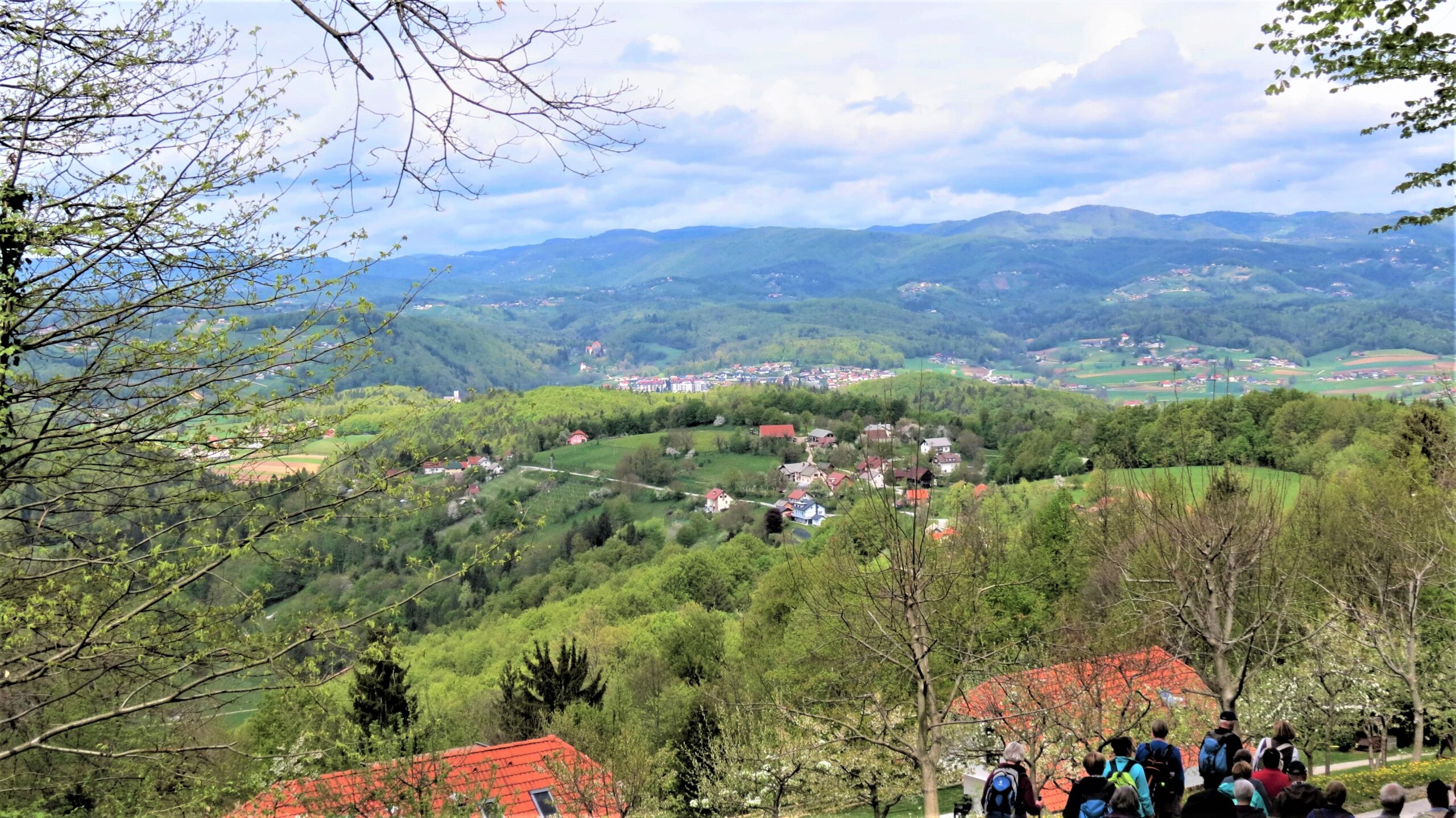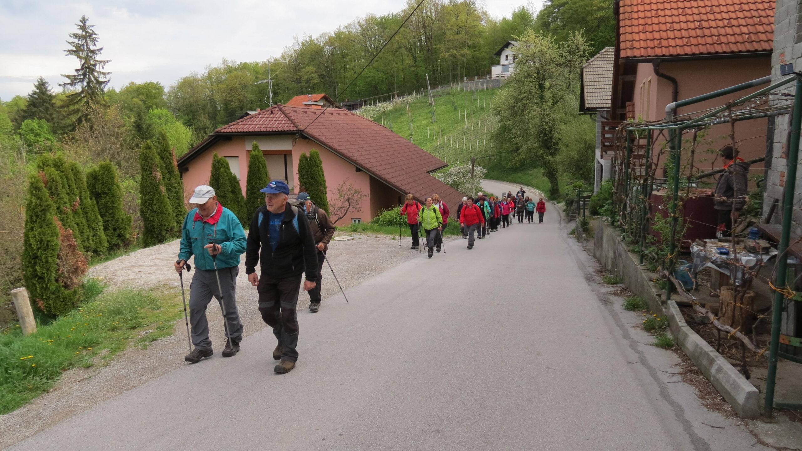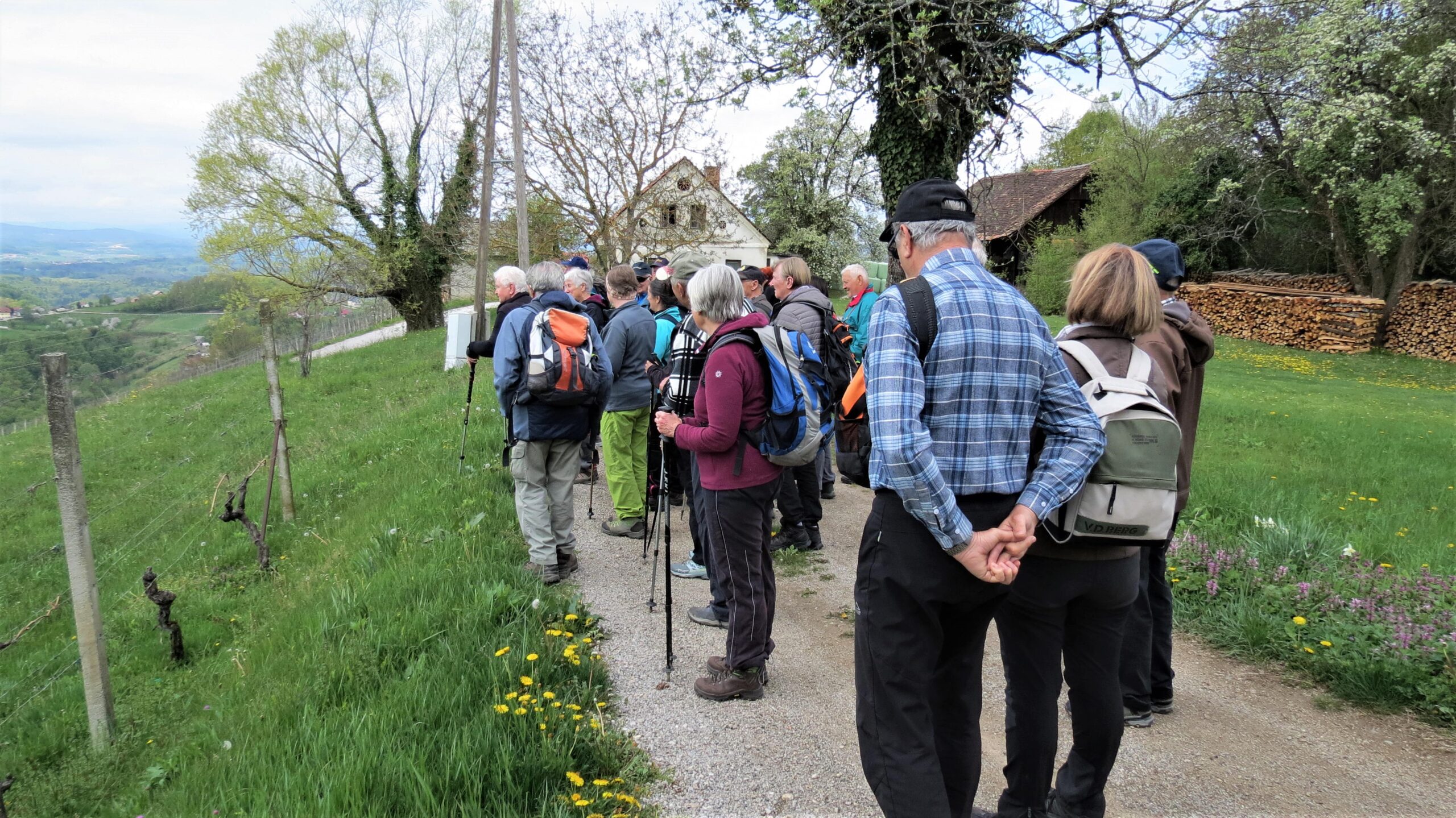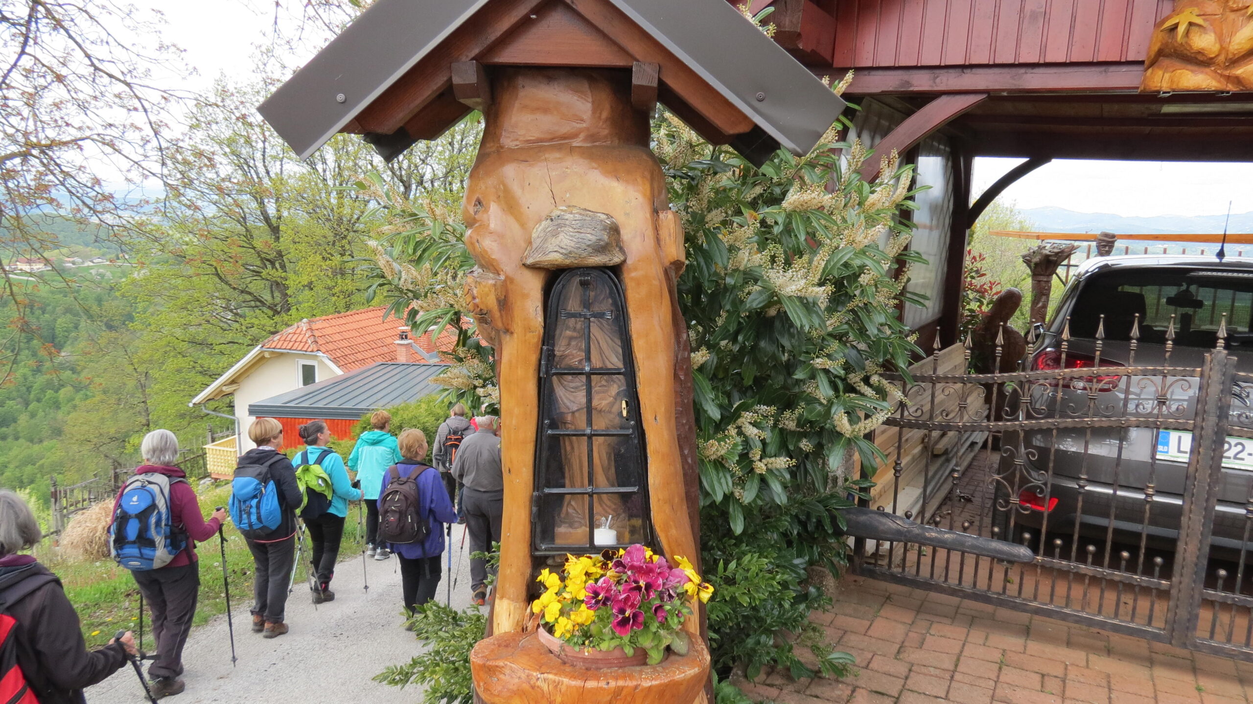 Prijazen oskrbnik nas je po predhodni najavi (ob torkih je koča zaprta) sprejel in postregel s toplimi in hladnimi napitki. Malico smo si privoščili iz nahrbtnika. Ob poti v dolino smo občudovali čudovito urejene vrtove, hiše, umetniške skulpture ob hišah in vrtovih, strme vinograde, cvetlice in cvetoča drevesa ter v daljavi daleč vidno pokrajino tja do Gorjancev.