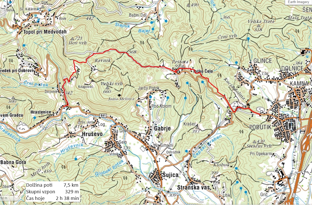 Hodili smo mimo posameznih kmetij, skozi redek gozd, ki pa je ponujal obilo cvetočega črnega teloha. Na polovici vzpona na planoto Ravnik se nam je pri kmetiji Seničar pridružil zlati prinašalec in nas spremljal vse do naselja Toško čelo. Naša družba mu je čitno prijala in veselo nam je kazal pot.
