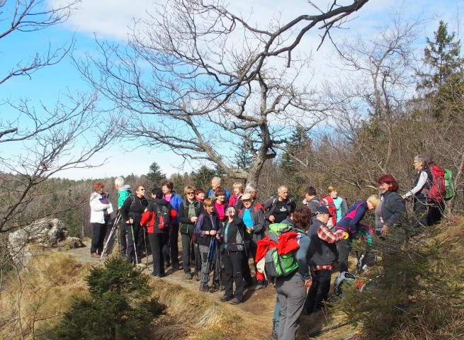 Pestra kamninska sestava, sem pomislila, ko je pritegnil našo pozornost  tuf – zelenkasta kamnina vulkanskega izvora. Vse to je Bohor,  se mi je pogled ustavljal  na pobočjih s pomladnimi rožami v odtenkih bele, rumene, roza in modre ter nazadnje zastal na brunarici pod visokimi jelkami, obnovljeni partizanski bolnici na Travnem lazu.  Po  oznakah  smo se spustili na gozdna  in travna pobočja, se za nekaj trenutkov ustavili na razgledišču Petrova skala ter s pogledi objeli  Krško polje in Gorjance v daljavi. Cvetoče preproge resja in visokih trav nad stezo so vabile, da bi malo  posedeli,  a  tik pred nami je že čakala koča in gospa Sonja Kostevc, varuhinja gorske narave pri PD Bohor Senovo,  ki nas je popeljala po delčku Zasavske planinske poti v smeri Debelega vrha. V tihoti so nas sprejele stasite jelke in bukve, ki skrbno varujejo zavarovana rastišča živo rumenih jaric. Pred tednom jih je še prekrival sneg, danes pa je skozi drevesa posijalo sonce in jarice so odprle svoje cvetove. Sonce in naši pogledi so se med potjo lovili na njihove venčne liste, mi pa smo že stali na, debelo s skalami posutem, Debelem vrhu, od koder so se videla hribovja Kozjanskega parka, nad Senovim in Krškim poljem. Tiste s fotografsko žilico so jarice  zvabile nazaj v gozd, od koder smo se po isti poti vrnili do koče in se tam poslovili od gospe Sonje.