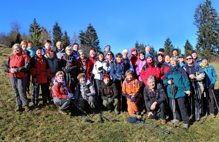 Nadaljevali smo po markacijah na visokih bukvah in jelkah, nekatere pa so belo rdeče sijale na skalnati podlagi steze. Gozd je bil lep, četudi razredčen zaradi vetroloma, žledoloma in lubadarja. Med pogovori o sedanjih in preteklih časih smo prišli iz gozda na planjavo do razgledišča pod Srnjakom, ki nam je v jasnem opoldnevu nudilo panoramski razgled na znana naselja, mesta in vasi pod nami, na prostrana hribovja, s skritimi dolinami v nedrjih, vse do Blegoša in zasneženih Julijcev. Nad rahlo belino Ljubljanskega barja so se levo bohotile Kamniške Alpe. Pogled je segal vse do Rogatca in Menine ter desno do Ljubljanskega vrha s Krimskim pogorjem, mi pa smo skoraj pozabili na malico.