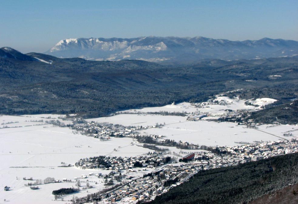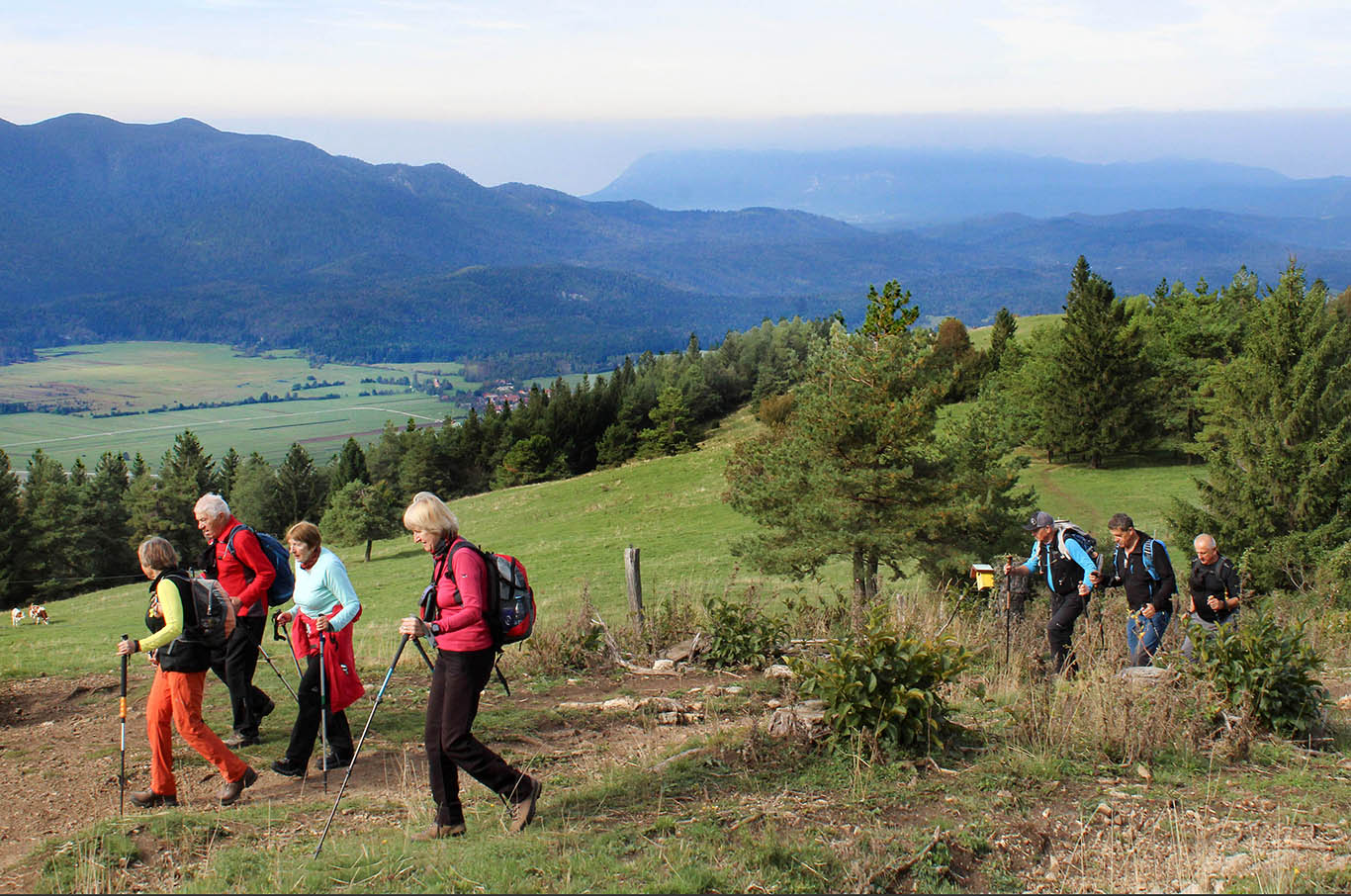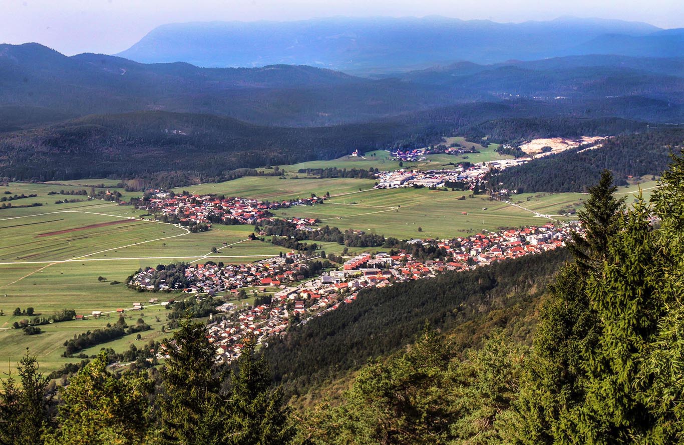 Zagrizli smo v začetno strmino po stezi, ki jo z obeh strani obdaja borov gozd in zastira poglede naokoli. Tako smo se lahko osredotočili na pot. Pa ni trajalo prav dolgo, ko so se začeli odstirati razgledi proti dolini, kjer ležijo obdelane njive, pokošeni travniki in poplavljene površine, trenutno še ne prav velikega presihajočega Cerkniškega jezera.