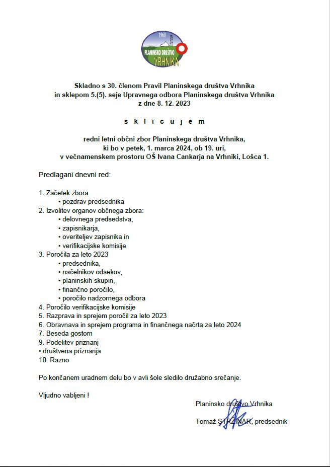 Vabimo vas na redni letni občni zbor, ki bo v petek, 1. marca 2024 s pričetkom ob 19. uri v avli OŠ Ivan Cankar na Lošci 1. Na začetku bo kratek kulturni program, kateremu bo sledil uradni del zbora. Po uradnem delu bosta sledila druženje in pogostitev.