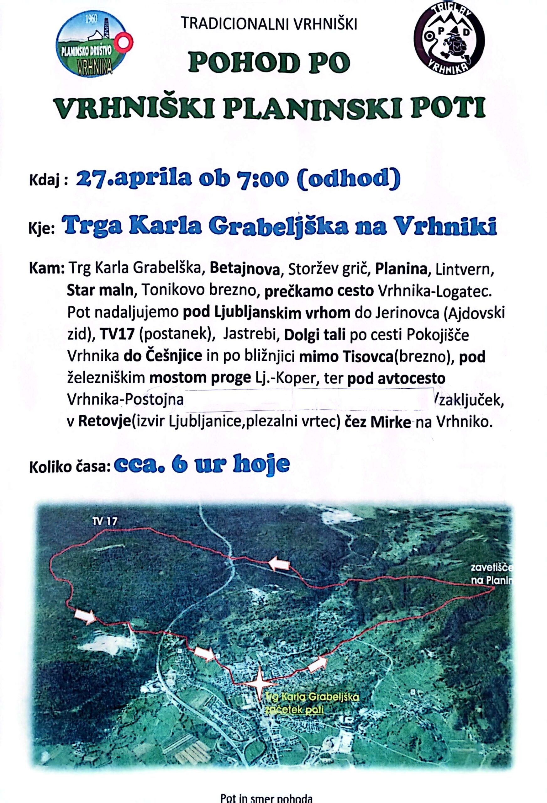 Vabljeni na tradicionalni pohod po Vrhniški planinski poti, v ponedeljek, 27. aprila. Pot bo potekala čez Planino nad Vrhniko, s spustom do Starega malna in se nadaljevala do kurirske postaje TV 17 pod Ljubljanskim vrhom. Vračali se bomo čez Dolge tale, do Češnjic in Retovja – izvira reke Ljubljanice na Vrhniki. Zbirno mesto: pred glasbeno šolo – Trg Karla Grabeljška 3, Vrhnika, ob 7. uri. Pot je krožna, zmerno zahtevna,cca. 6 ur hoje. Prijave niso potrebne. Informacije: 040‐580-175.